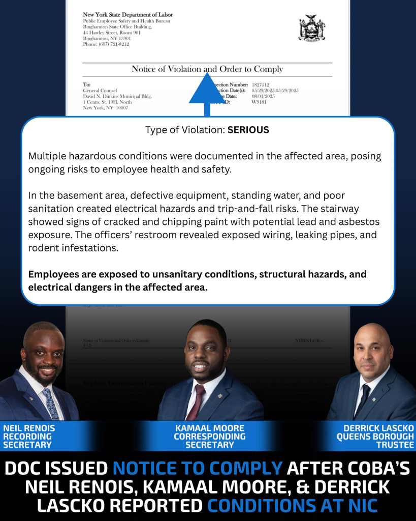 After Recording Secretary Neil Renois, Corresponding Secretary Kamaal Moore, and Queens Borough Trustee Derrick Lascko reported hazardous conditions at the North Infirmary Command, the Department of Labor responded with a Notice to Comply citing a serious violation.