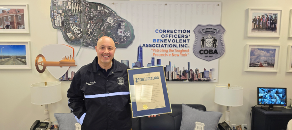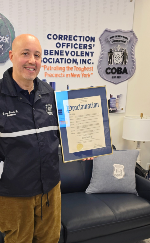 COBA proudly congratulates our President, Benny Boscio Jr., who was recognized in the form of a Proclamation, from Queens Borough President Donovan Richards Jr. The proclamation was awarded to COBA President Boscio for his exemplary service to the department, and to the 5000 members he serves as the Union President.